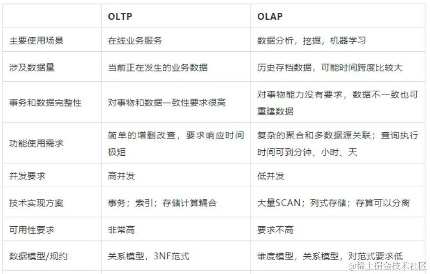 这里可能有些人员不懂什么是 OLAP,下面是一个OLAP与OLTP对比图