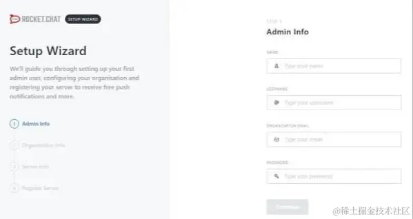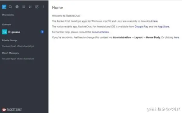 填写所需的表单就可以了。经过四个简单的设置窗口后,你应该会进入 Rocket.Chat 主页: