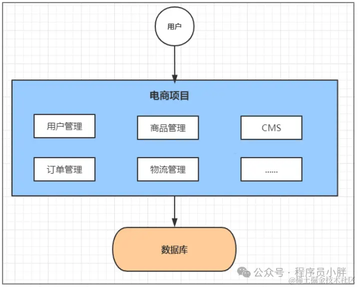 互联网早期, 一般的网站应用流量较小, 只需一个应用, 将所有功能代码都部署在一起就可以, 这样可以减少开发、部署和维护的成本。比如说一个电商系统, 里面会包含很多用户管理、商品管理、订单管理、物流管理等等很多模块,我们会把它们做成一个web项目, 然后部署到一台tomcat服务器上.