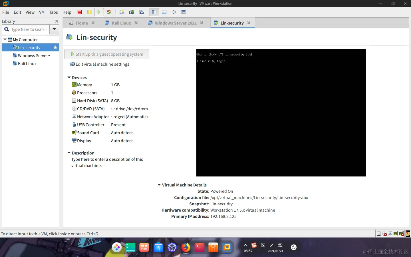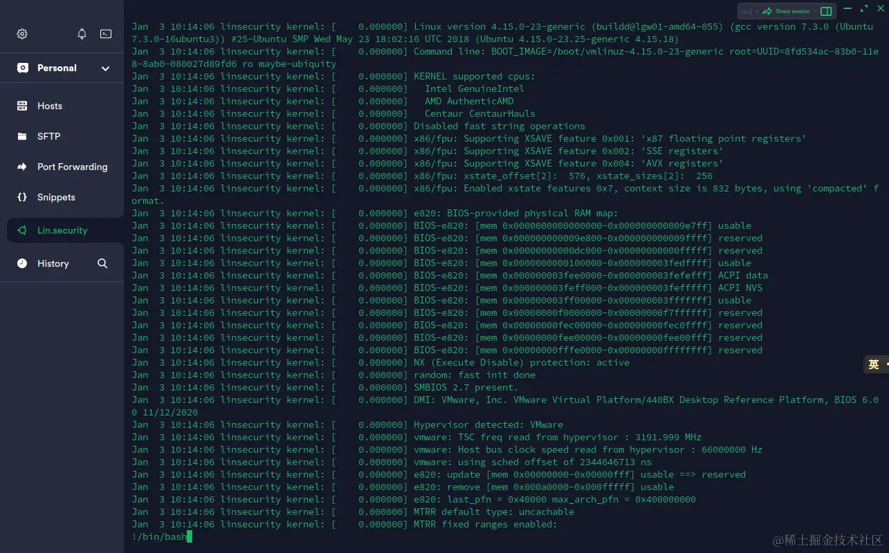 从分享的网盘链接中下载靶机压缩包并解压后,点击VMware Workstation主页的File => Open按钮,在弹出的文件选择窗口中选中Lin.security.ovf文件打开后即可导入靶机。使用上面给出的登录凭据即可登录系统进行提权练习。