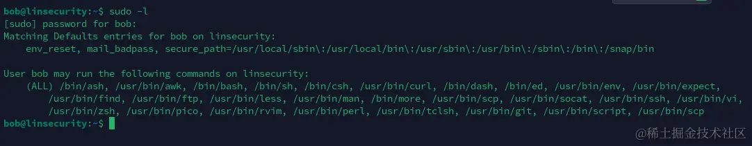 bob@linsecurity:~$ sudo /bin/bash