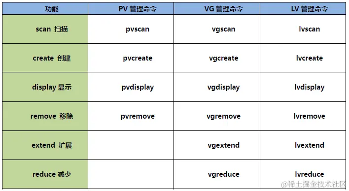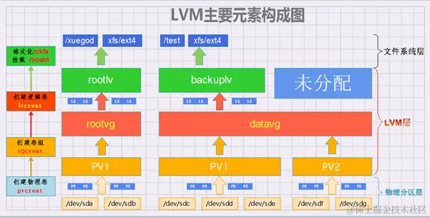 创建LVM流程:pvcreate创建pv -> vgcreate创建卷组 -> lvcreate创建逻辑卷 -> mkfs.xfs lv 格式化-> mount挂载