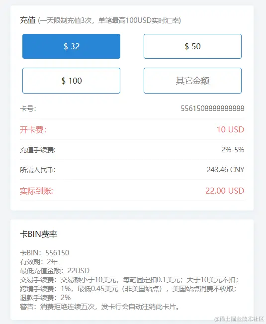 点击申请,选择支付宝,需要注意:充值的最少金额是$32,最后到账是$22,因为这里面包含了一个$10的开卡费用,之后再充值就不再收取开卡费了,充多少就是多少了