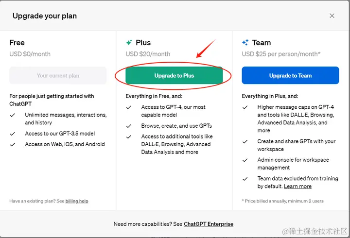 我们这篇攻略的目的就是升级GPT4.0版本,点击:upgrade to plus