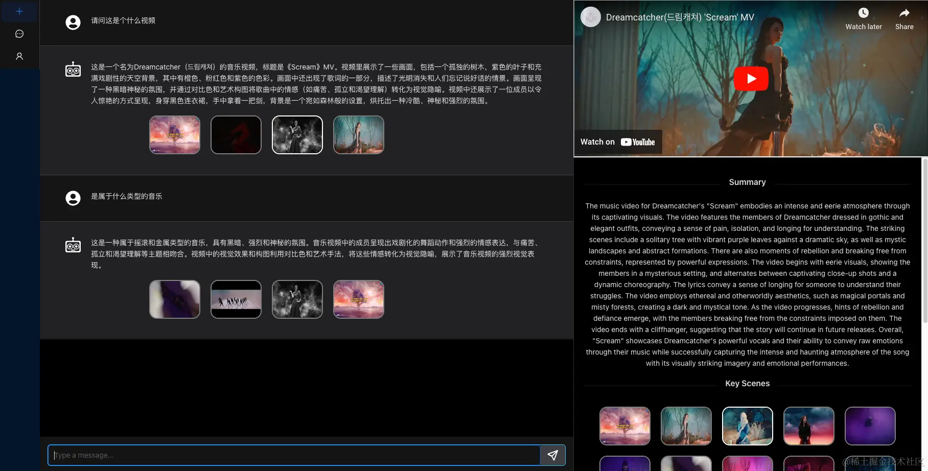 一个能够解析 Youtube 视频内容,并能回答问题的聊天机器人。无论是音乐 mv,还是访谈视频,只需要输入视频链接并等待解析完成之后,就可以向机器人提问问题了。除了提取视频摘要之外,还可以分析视频的关键场景,可以据此做相关提问,回答的答案还是比较准确的。