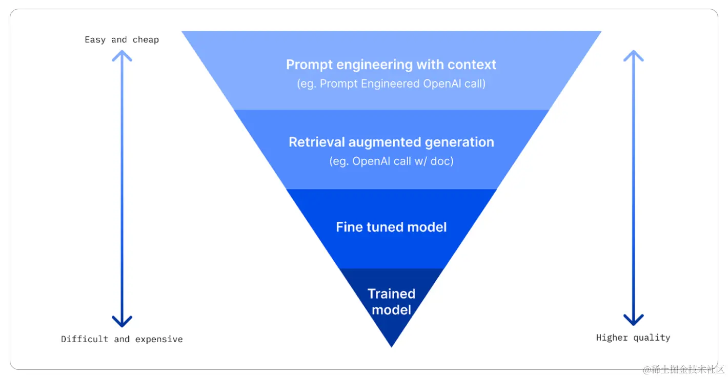 微调模型。 在这里,你根据你自己的数据进一步训练模型,这使得模型更加准确并且能够响应你的需求,但可能成本高昂。