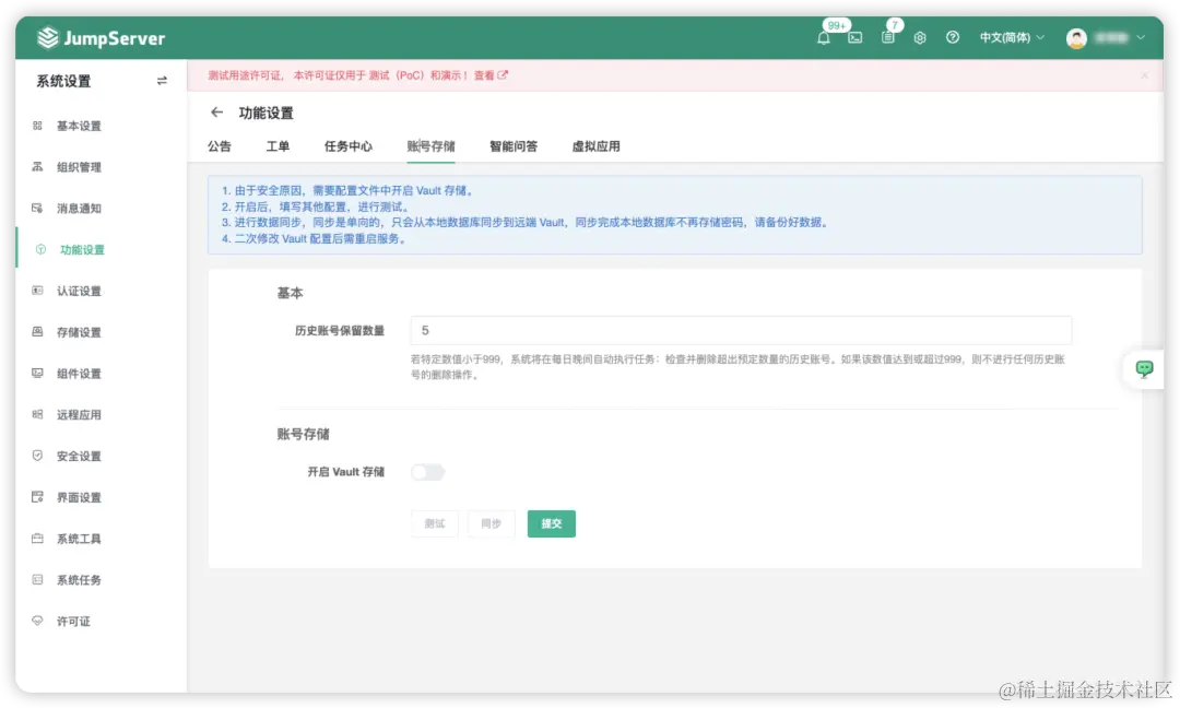 在JumpServer v3.10.2 LTS版本中,资产历史账号支持设置保留数量,以满足用户的安全性需求。管理员可以在JumpServer中选择“系统设置”→“功能设置”→“账号存储”,设置资产历史账号的保留数量。