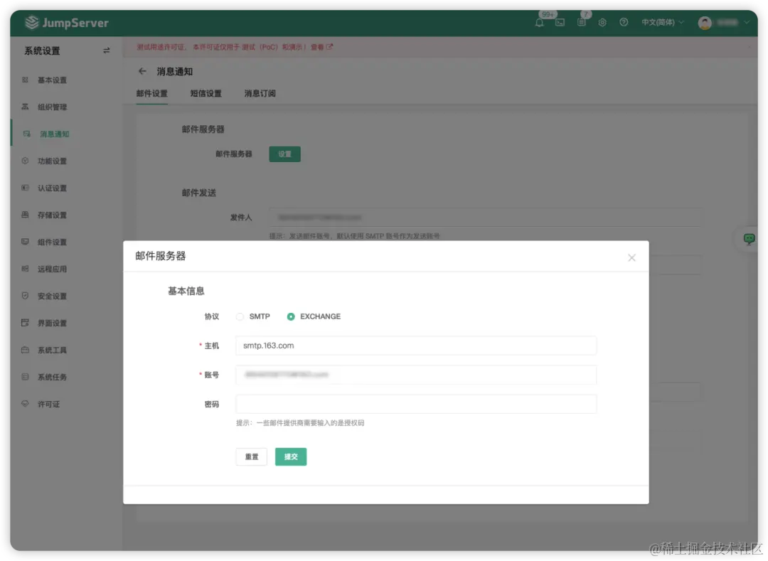 管理员可以在JumpServer中选择“系统设置”→“消息通知”→“邮件设置”,修改邮件配置时选择Exchange协议。