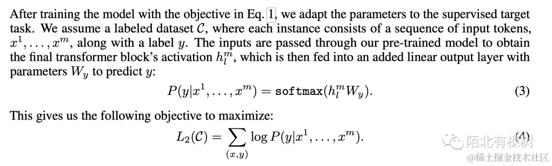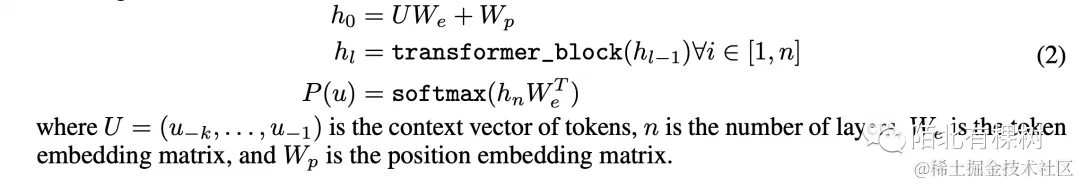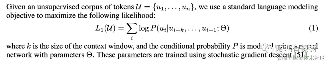 假设我们有一个没有标注的文本,其中每个单词被表示为一个向量 ,整个文本被表示为一个序列 到 ,这些单词是有序列信息的,所以顺序是不能改变的。GPT使用标准的语言模型目标函数来最大化似然函数,如下面这个公式: