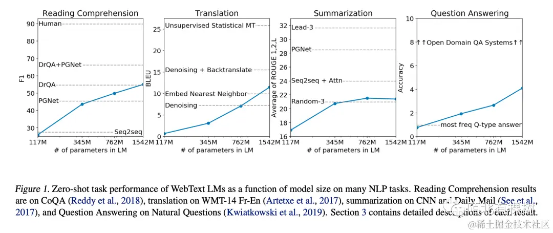 下图展示了GPT2的Zero-task在四个场景下的具体表现,可以看到在阅读理解上来说,它的表现是高于原有模型的,但是在摘要、提问、翻译的场景下,表现情况均不如原有模型。