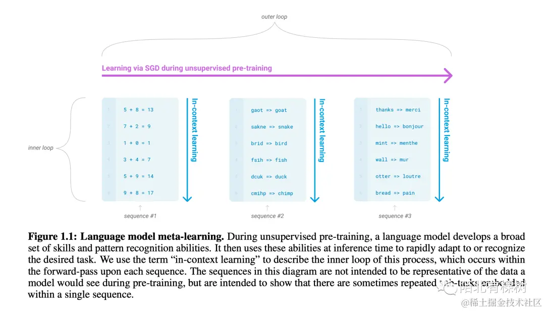 在这里作者又提出两个新的名词,Meta Learning和in-context learning,Meta Learning 是一种训练模型的方法,它可以帮助模型更好地适应不同的任务和领域。在 Meta Learning 中,模型不仅要学习如何解决特定的任务,还要学习如何快速适应新的任务。这样的训练方法有助于提高模型的泛化能力,使得模型在新的领域中表现更好。in-context learning 是另一种训练模型的方法。它指的是在给定一个任务的上下文中,让模型从少量样本中学习如何解决这个任务。in-context learning 只会对给定的任务产生影响,不会改变模型的权重。