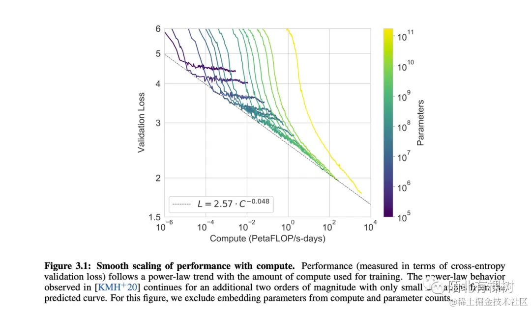 下图展示的是不同大小的预训练模型在训练过程中与计算量之间的关系。在图中,我们可以看到每根线代表一个不同设置的模型,而黄色线代表的是GPT上最大的模型,蓝色线则表示最小的那个模型。X轴表示的是计算量,Y轴表示的是验证损失。由于验证损失与子任务上的精度有关,所以可以很好地表示预训练模型的好坏。
