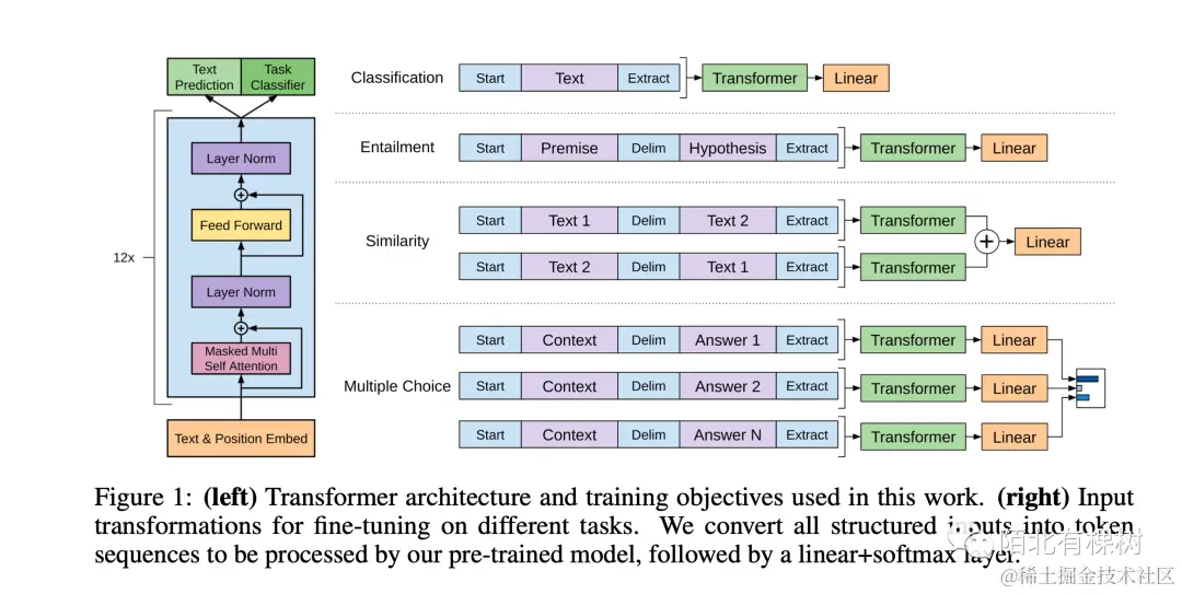 与计算机视觉中的算法类似,自然语言处理中的解决方案也是先训练好预训练模型,然后进行微调。不同的是,自然语言处理使用的是没有标注的文本数据进行训练,这是一大步的进展。GPT系列文章在此基础上进行了更深入的探索,取得了一定的创新成果。此外,自然语言处理任务的多样性也导致了需要为每个任务构建不同的模型,这也是自然语言处理与计算机视觉的一个区别。GPT采用的解决方案是改变输入的形式而不是改变模型本身,这可以减少改变模型架构的工作量。