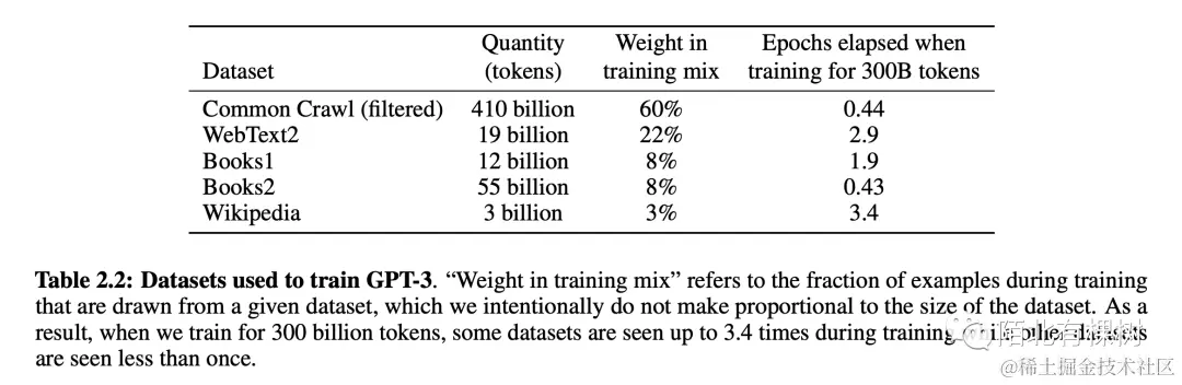 GPT-3的训练数据基于Common Crawl,但作者认为Common Crawl的数据质量相对较低。为了解决这个问题,作者使用了一些技巧来使数据更干净。他们使用了一个简单的逻辑回归分类器来区分高质量数据和低质量数据,使用LSH算法去重,以及加入了一些已知的高质量数据集。通过设置采样率,其中60%来自Common Crawl,22%来自WebText2,其余的来自其他数据集,最终他们获得了一个非常大的数据集。虽然作者没有详细解释权重是如何计算的,但是作者认为这个数据集质量相对较高。下图是各种数据以及相应的权重