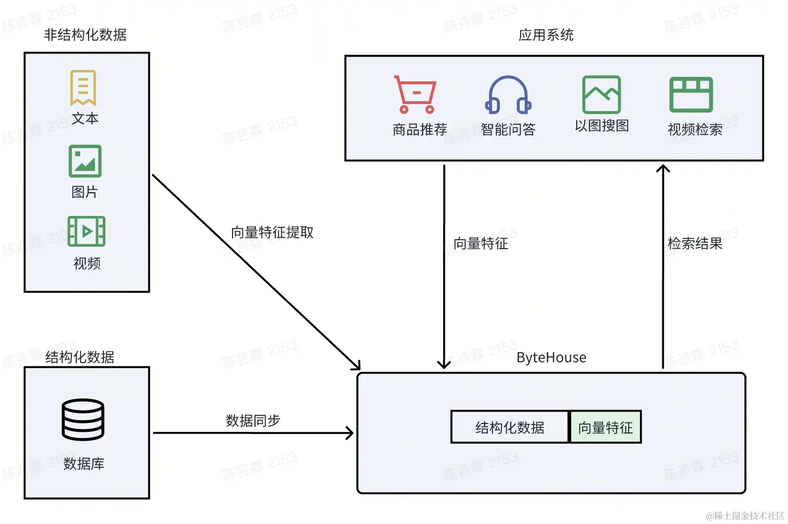 作为一款OLAP引擎,ByteHouse在支持结构化数据的单表、多表复杂查询计算基础上,扩展了向量检索能力,支持向量数据存储、索引和高效检索,从而支持商品推荐、智能问答系统、图片搜索、视频检索等应用场景。