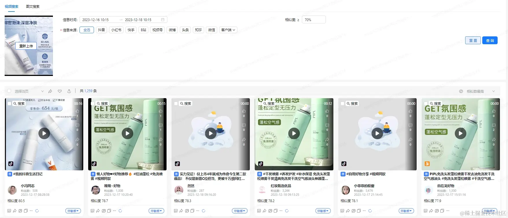 如下图所示,ByteHouse支持上传一张图片,并输入时间、相似度、信息来源等条件,检索全网视频中与目标图片相似视频,该场景利用了ByteHouse的标量数据与向量数据混合检索能力,采用如下的SQL语句即可进行快速检索: