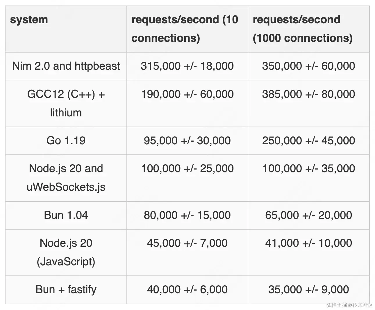 该文主要是关于不同系统和框架的性能测试结果。作者使用了不同的连接数和不同的系统进行测试,并记录了每个系统的每秒请求数。根据测试结果,Go和Bun似乎在性能方面表现较好,而Node.js则比较慢。其他语言(如Java、C#、Python等)的性能则介于其中。