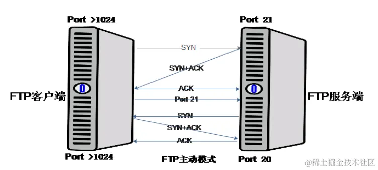 FTP主动模式:客户端从一个任意的端口N(N>1024)连接到FTP服务器的port 21命令端口,客户端开始监听端口N+1,并发送FTP命令“port N+1”到FTP服务器,FTP服务器以数据端口(20)连接到客户端指定的数据端口(N+1)。