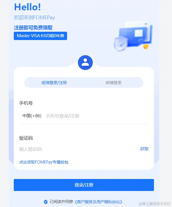 打开Fomepay登陆界面,选择直接手机号登录,去申请万事达卡