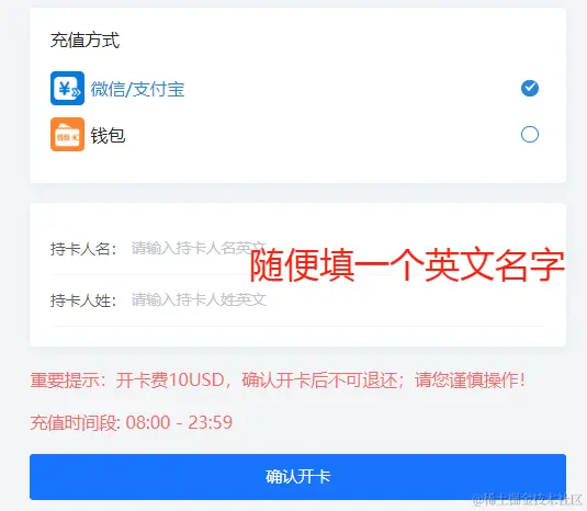 点击申请,选择支付宝,需要注意:充值的最少金额是$32,最后到账是$22,因为这里面包含了一个$10的开卡费用,之后再充值就不再收取开卡费了,充多少就是多少了