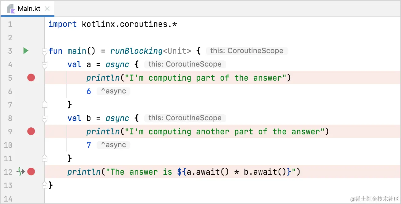 凡是IDE,或者说敢称自己是IDE的,肯定有调试功能,也就是step-by-step式的单步跟踪功能。对Kotlin比较友好的IDEA和Android Studio自然也不例外。协程也是标准的Kotlin代码,所以也是可以调试的,并且在调试方面其实没有区别。都是先在代码中设置断点,然后使用虫子图标的『Debug』功能就好了。对于IDEA系(包括Android Studio),设置断点就是在代码编辑器行号旁边点一下就可以了: