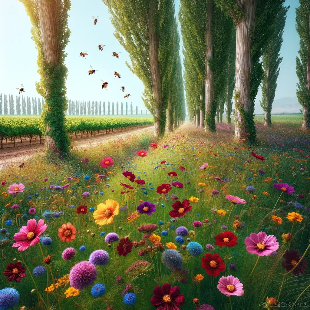 路旁遮阴的钻天杨,田野上一望无垠的葡萄架……初夏时节,各色野花都开了:红的,紫的,粉的,黄的,像绣在一块绿色大地毯上的绚丽斑点;成群的蜜蜂在花丛中忙碌着,吸着花蕊,辛苦地飞来又飞去…… 从维熙《献给医生的玫瑰花》
