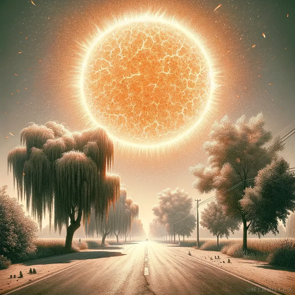 八月的骄阳像张火伞,中午,天空亮得耀眼,好像一大张烧烫了的白马口铁板。路边垂柳的细枝一动不动,树影缩成了一团,蒙着一层尘土的叶子都蔫蔫地打卷了。柏油路面也被晒得软软的,向远方望去,寂静无人的马路上,似乎有一片透明的蒸气在升腾。