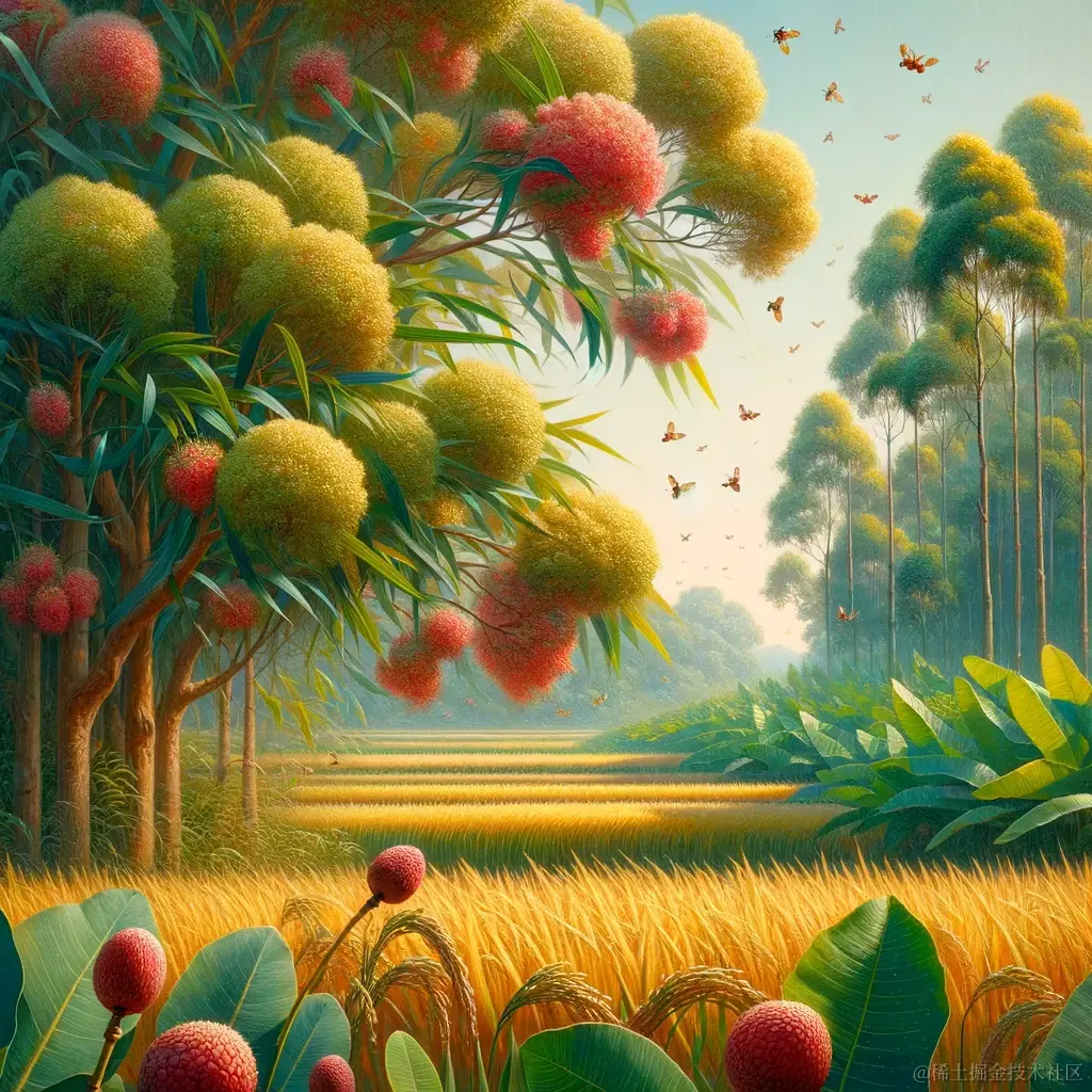 桉树的绿叶婆娑摇摆,成熟的稻田一片金黄,偶尔出现一片芋田,那颜色又绿得像要滴下油来;有时路旁又出现几株荔枝,累累的果子正在蝉声中逐渐发红。好一幅色采浓烈的盛夏图画!