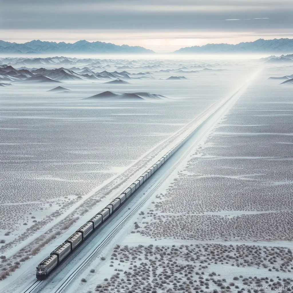 列车在展平展平的戈壁沙原上行进着。铁路两旁的荒野,一望无际。假若没有视线尽头那些依稀可见的山影,你简直想象不出沙原究竟伸展到什么地方。正是初冬季节,一层薄薄的白雪,象巨大轻软的羊毛毯子,覆盖在这广漠的荒原上,闪亮着寒冷的银光……(李季:《马兰》