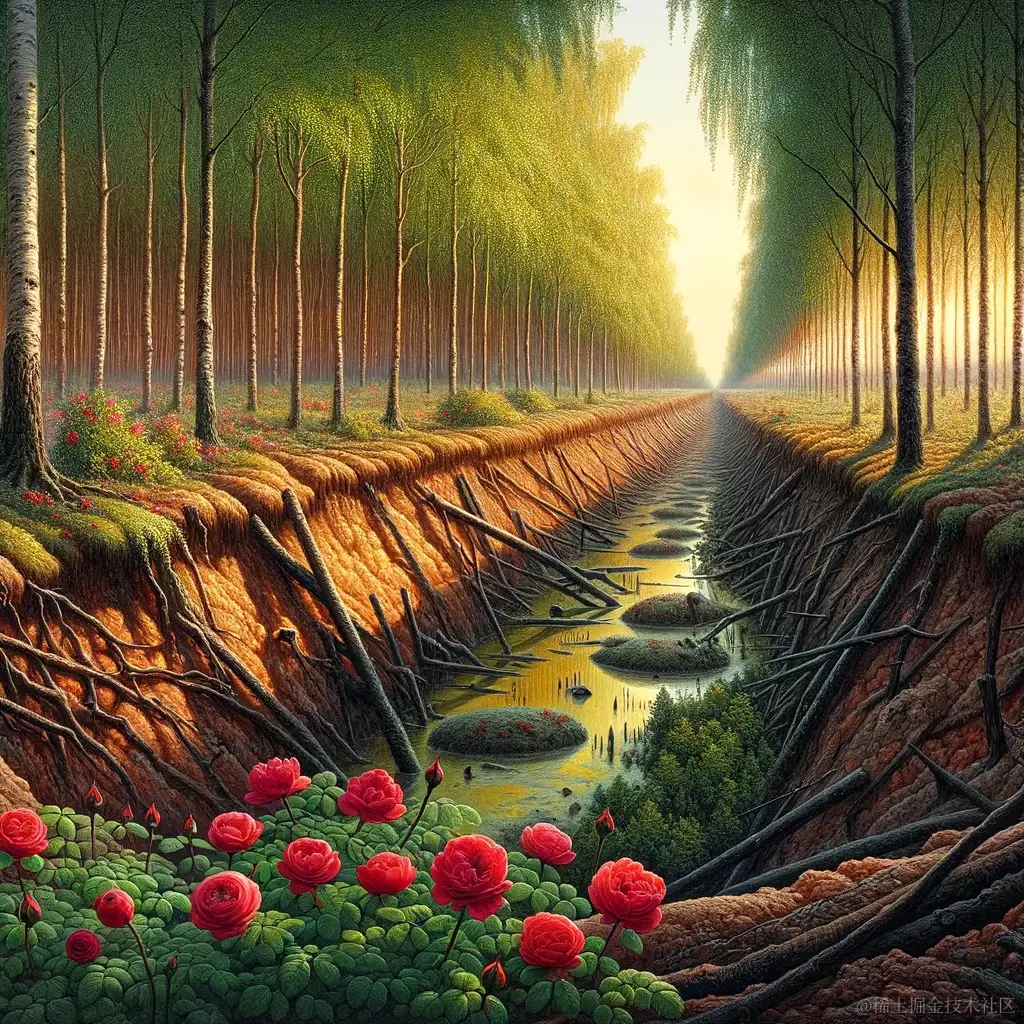 战壕后面,一片茂密的赤杨和嫩白桦树绿荫的外面,是一片战前已经开采过泥炭的池沼,闪烁着铁锈一样的光亮;野蔷薇愉快地开出了象小红果子一样的花朵。右面一点,一个突出的树林角的外头,伸展着一条被炮弹破坏了的公路,使人觉得很象是一条荒僻的、无人走过的道路;树林子边沿上生着一些衰老的、被枪弹扫射过的艾蒿,许多烧焦的树根象驼背一样在地上鼓起来,褐色的土坝发着黄光,弯弯曲曲的战壕线顺着光秃秃的田地远远地向一旁伸展出去。后面,就连被挖掘得高低不平的泥炭池沼和被破坏的道路——还都叫人感觉到保留着生活的痕迹,保留着人类劳动过的痕迹,树林子边沿上的土地使人看起来很象是一幅凄凉的、悲哀的图画。([苏]肖洛霍夫:《静静的顿河》)