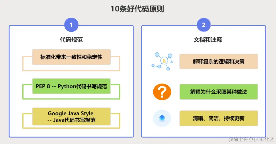 好的代码应该编写清晰的文档和注释来解释复杂的逻辑和决策,注释应该解释为什么采取某种做法(Why),而不是解释具体做什么(What,这是代码内容应该做的)。文档和注释应该清晰、简洁,并持续更新。
