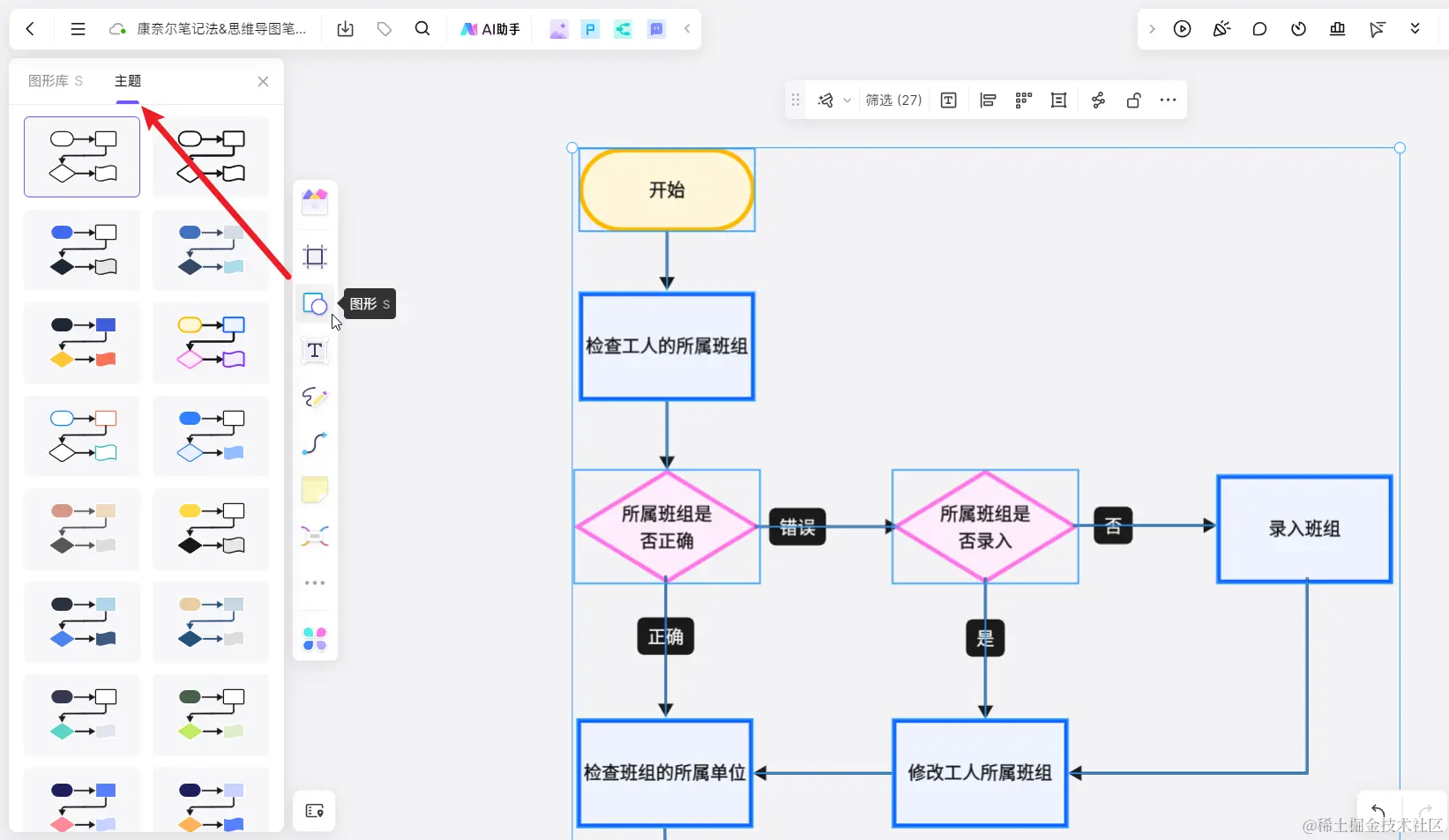 用鼠标框选整个流程图,点击左侧菜单栏的「图形」工具,打开图形库面板,接着点击面板上方的「主题」选项卡,切换到流程图「主题」界面,可以看到这里提供了多种不同风格的流程图主题样式。