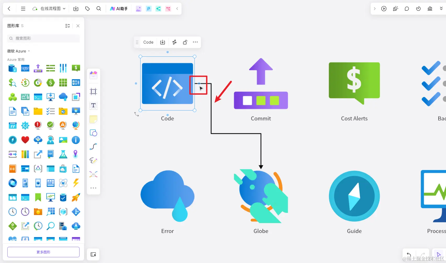 选中boardmix白板上添加的图形,图形四周会出现 4 个蓝色的小圆点,将鼠标指针移动到蓝色圆点上方,长按左键可以拖拽出连接线,连接到周围的其他图形或文本上~