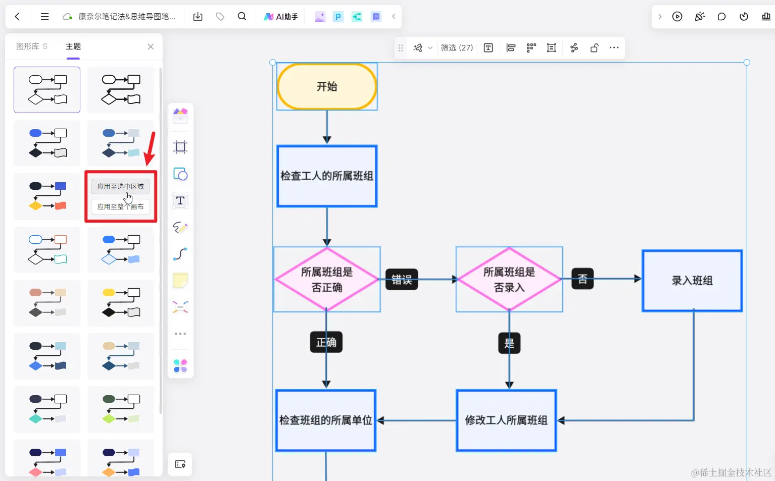- 应用至选中区域:局部美化,只美化鼠标框选的流程图区域