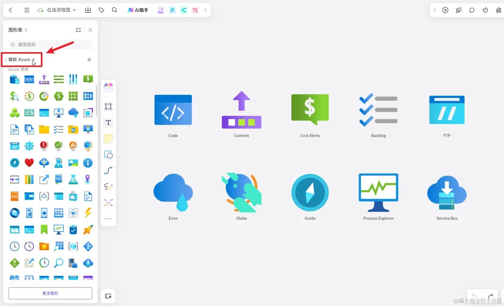 在打开的boardmix白板中,点击左侧菜单栏的「图形」工具,打开图形库面板,就能看到boardmix内置的所有图形,涵盖流程图、基础图形、ORG组织结构图、UML、BPMN、实体关系图(E-R图)、数据流图、网络拓补图、微软 Azure、思科(Cisco)、阿里云类别。