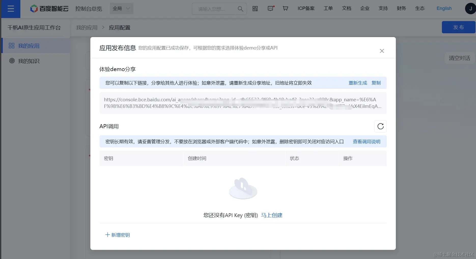 - 创建API key 很简单,点击创建会默认生成key。