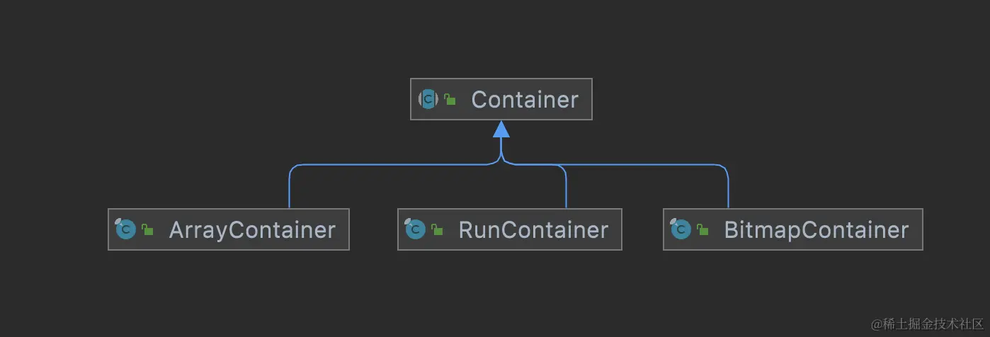 我们当前使用的RoaringBitmap版本为0.8.13,Container包含了三种实现:ArrayContainer(数组容器),BitmapContainer(位图容器),RunContainer(行程步长容器)