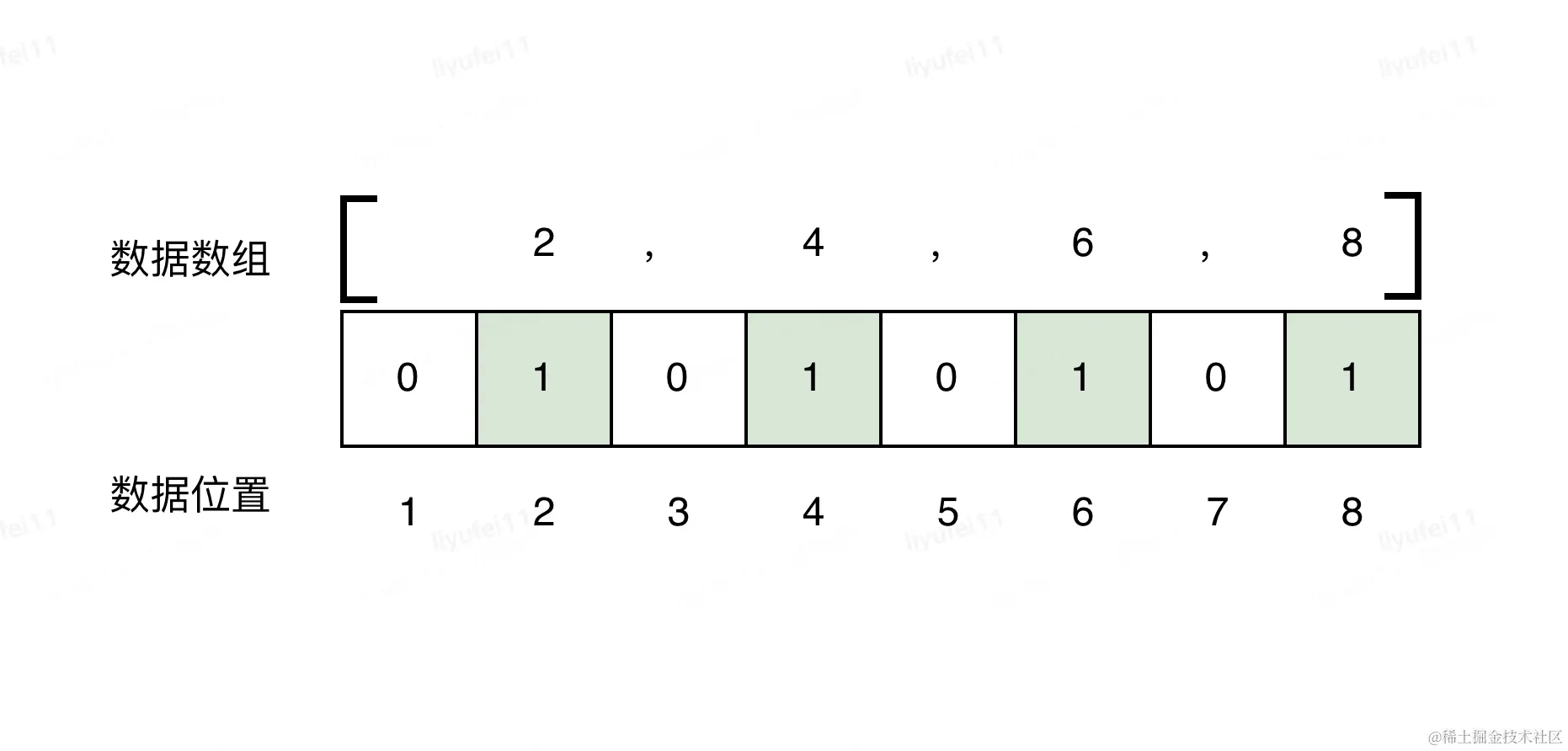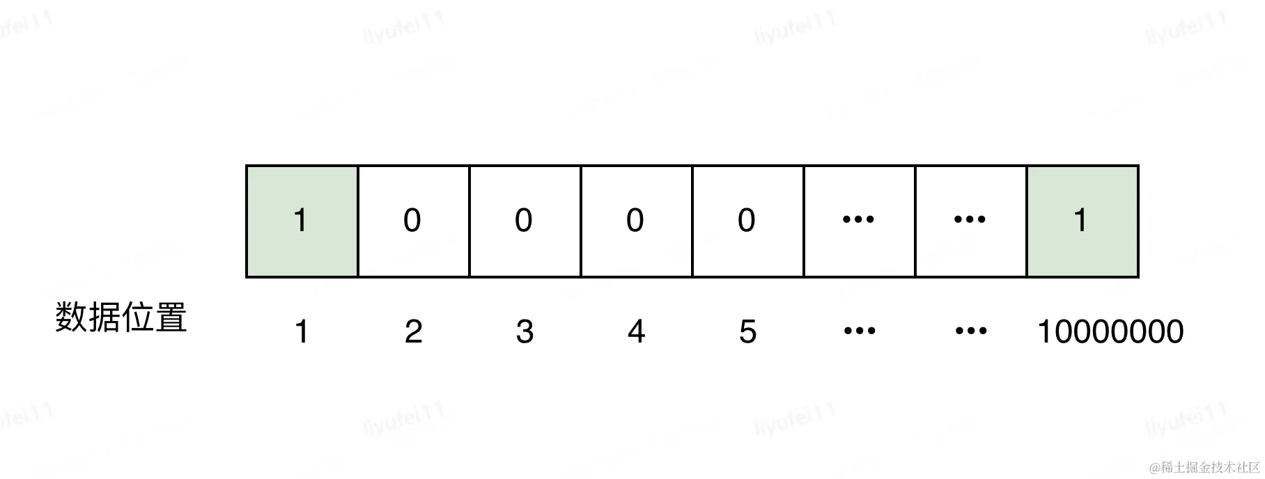 而如果采用bitmap的思想,只需要构建一个8bit空间,也就是一个字节的空间来存储,如下图。