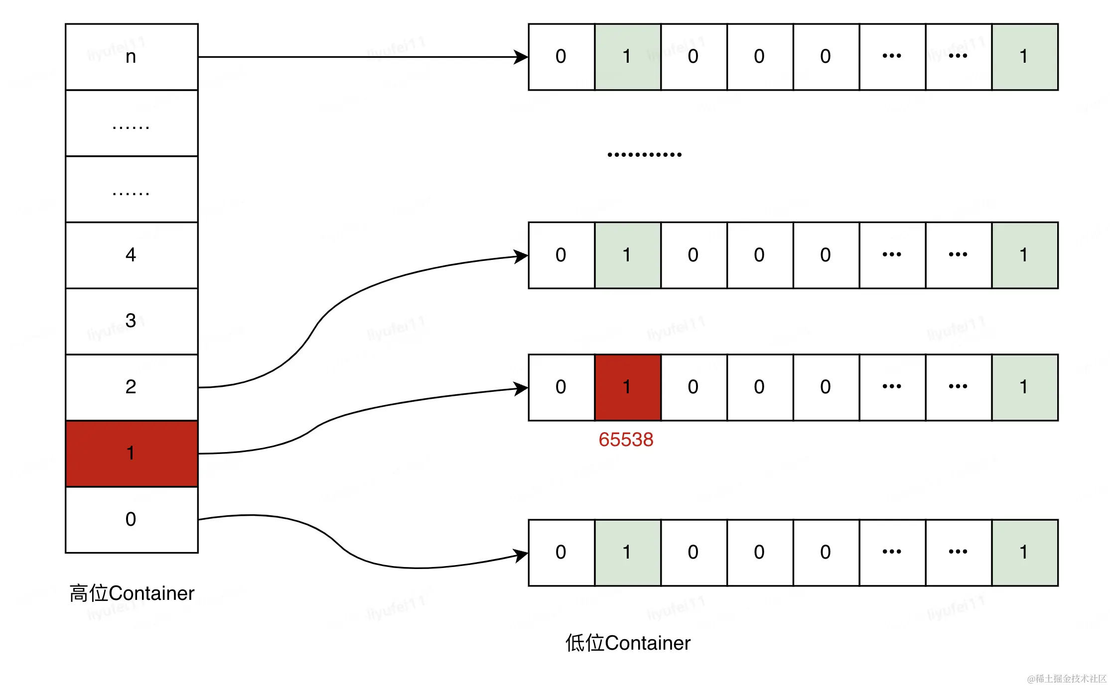 以整型int(32位)为例,将数据分成高16位和低16位两部分,低16位不变,作为数据位Container,高16位作为桶的编号Container,可以理解为高位的Container中,存放了很多个低位Container。