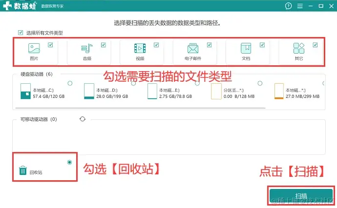 第1步:下载软件后,先点击【免费试用】,可对数据进行免费扫描,进入选择界面后,根据实际的恢复需求,勾选上需要扫描的文件类型,同时勾选上【回收站】,单击【扫描】 ;
