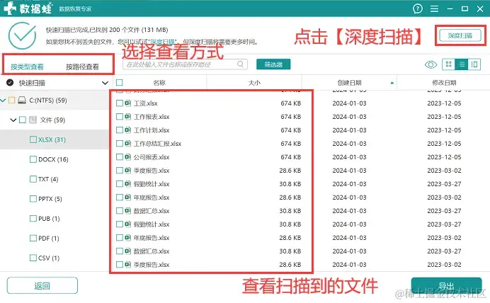 第2步:快速扫描完成后,建议用户先按照所选的文件类型对文件结果进行查看,看看误删的文件是否被扫描到,如果此次扫描只扫描到部分数据,点击 【深度扫描】 ;