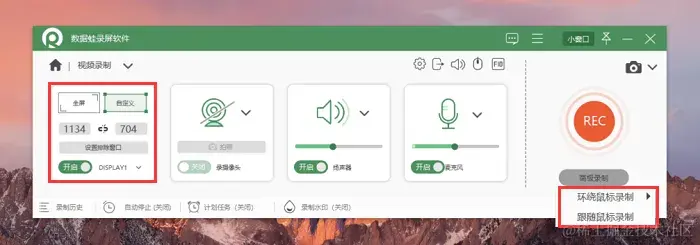 步骤2:在视频录制模式里,我们可以自定义录屏范围,点击 “高级录制” 按钮,还能选择环绕鼠标录制与跟随鼠标录制。