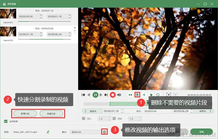 步骤3:录制结束后,软件提供了 “视频剪辑” 功能,我们可以直接在上面对视频进行剪辑,还可以添加特效、快速分割等多种操作。