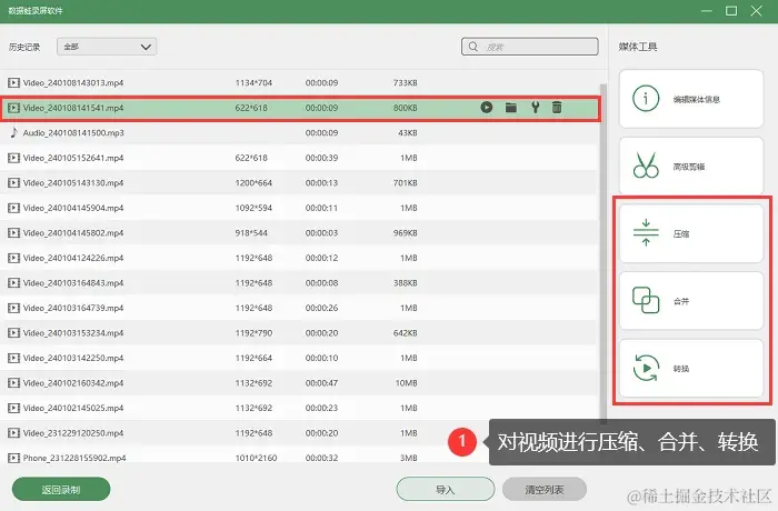 步骤4:在历史记录页面,我们还可以对视频进行后期处理,例如压缩、转换、合并等高级操作。