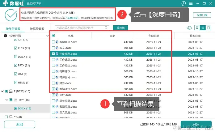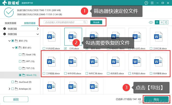 步骤4:软件深度扫描完成后,可对所有扫描到的文件进行扫描,在文件较多的情况下,建议用户借助【筛选器】对重要文件进行定位,完成定位后,勾选上要恢复的文件,并点击 【导出】 。
