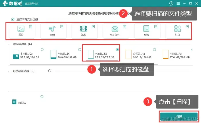 步骤2:先勾选上要进行扫描的磁盘,再勾选上需要扫描的文件类型(新手建议全选),完成后,点击【扫描】 ;