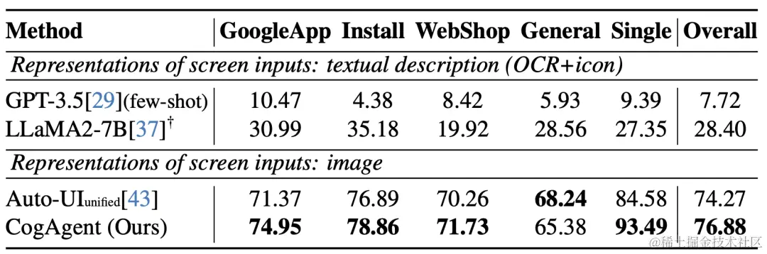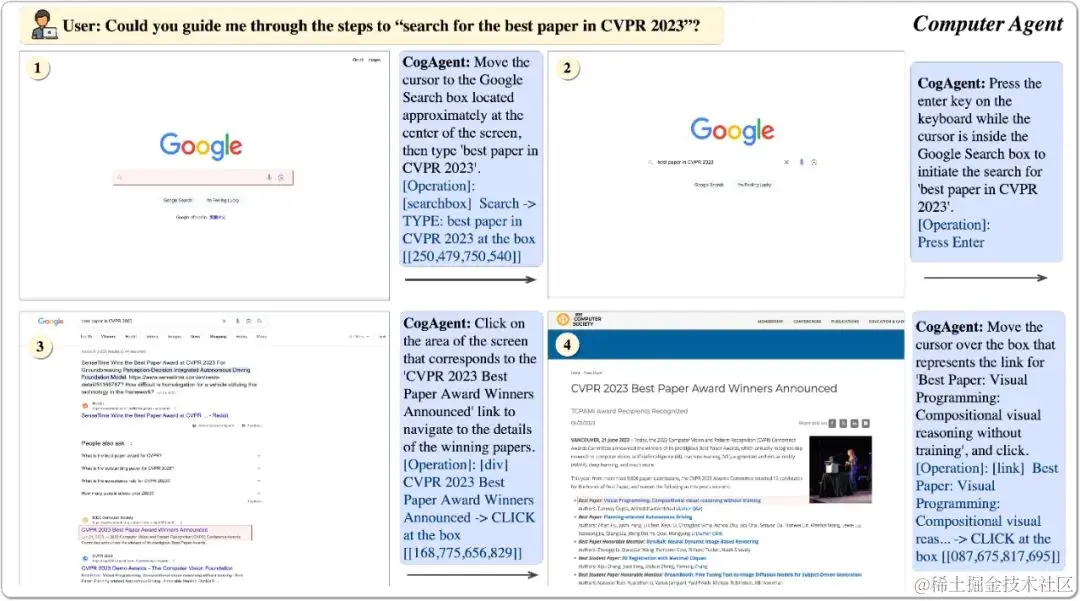 CogAgent模型同时接受当前GUI截图(图像形式)和用户操作目标(文本形式,例如“search for the best paper in CVPR 2023”)作为输入,就能预测详细的动作,和对应操作元素的位置坐标。