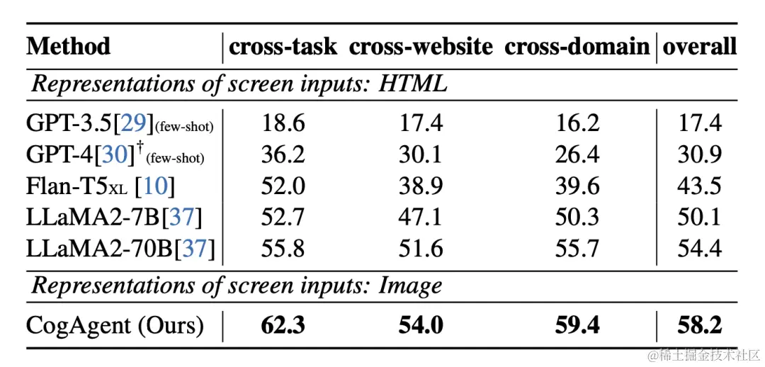 - 在网页Agent数据集Mind2Web上的性能