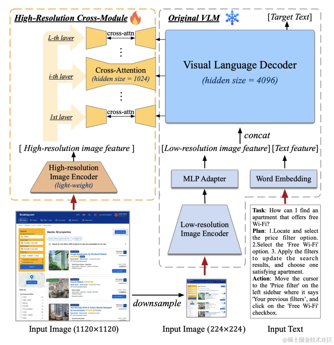 在模型结构上,CogAgent采用了独特的“高分辨率交叉注意力模块”,这是一个轻量级的模块,结合了高分辨率小图像编码器和原有的VLM(视觉语言模型)。通过这种设计,CogAgent能够在保持较低计算成本的同时,有效处理高分辨率图像。