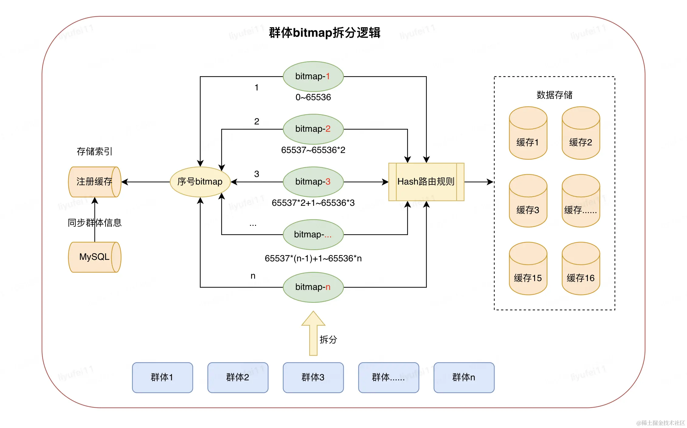 针对群体数据,同样采用了拆分的思路**,**把每一个群体按照固定区间切成若干个小的bitmap,并为每个小bitmap编号(即桶号,此桶号同样采用bitmap存储在索引里),缓存key为群体code加上桶号,以便快速取到offset值。